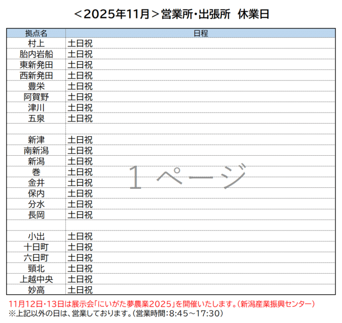 11月度 営業所・出張所休日予定について